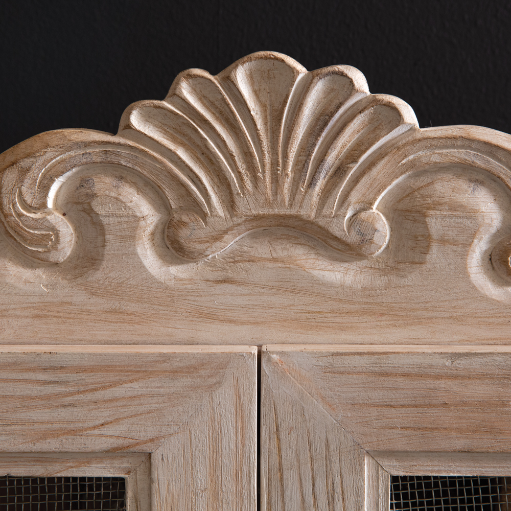 Create a space for toiletries, medicine, or spices with our wall cabinet. Crafted from solid mango wood, this piece features antique brass knobs, wire mesh cabinet doors, and an intricate filigree carving. Real wood is a product of nature, and as such, no two pieces are alike. Variations in grain, patterns, and color are to be expected and help create a beautiful and unique one-of-a-kind piece. To hang, use its two D-ring hangers.