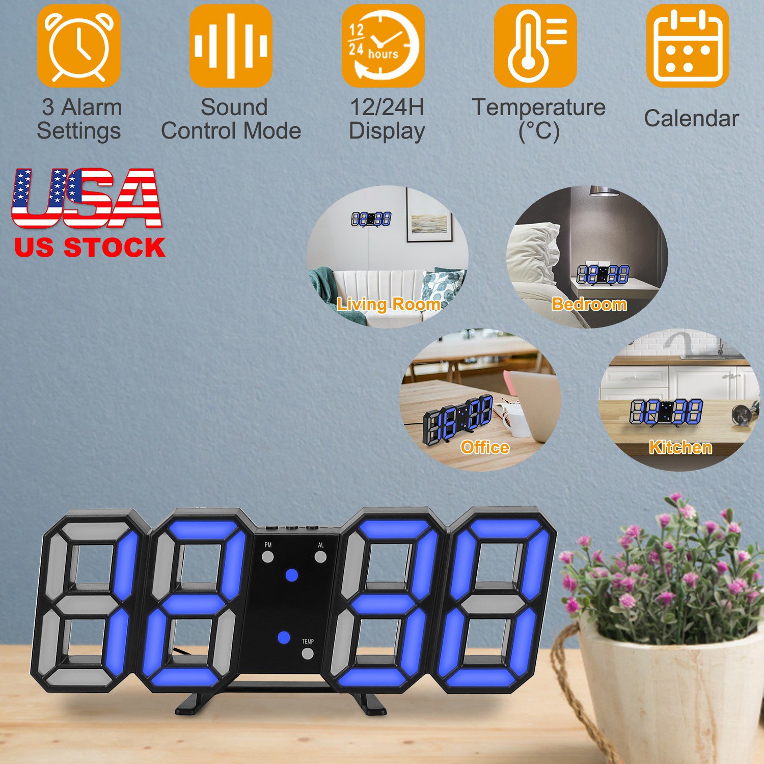 Our Multifunctional Digital Clock can display date, time in 12h or 24h format and temperature in Celsius, providing 3 alarm settings. With a large 3D display, it's easier to read at night. Support sound control mode, enables LED auto off in 30s, power-saving. You can hang on the wall with a hole on the back, or place on the desk with a stand.