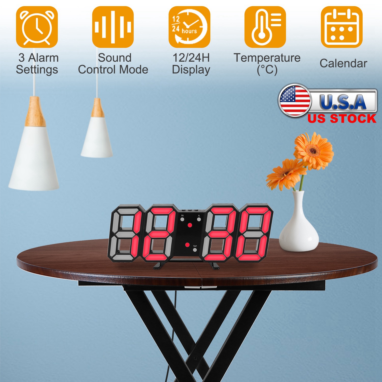 Our Multifunctional Digital Clock can display date, time in 12h or 24h format and temperature in Celsius, providing 3 alarm settings. With a large 3D display, it's easier to read at night. Support sound control mode, enables LED auto off in 30s, power-saving. You can hang on the wall with a hole on the back, or place on the desk with a stand.
