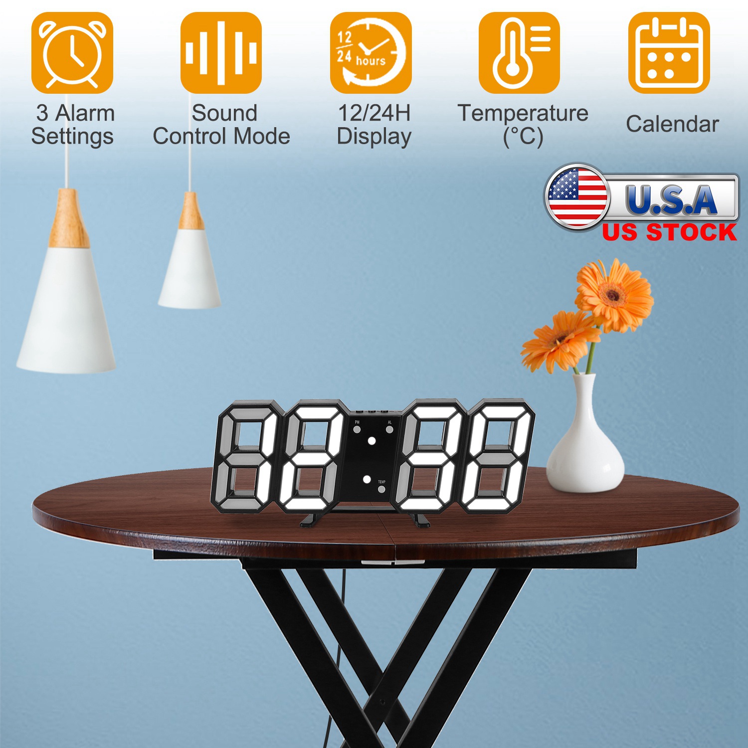 Our Multifunctional Digital Clock can display date, time in 12h or 24h format and temperature in Celsius, providing 3 alarm settings. With a large 3D display, it's easier to read at night. Support sound control mode, enables LED auto off in 30s, power-saving. You can hang on the wall with a hole on the back, or place on the desk with a stand.