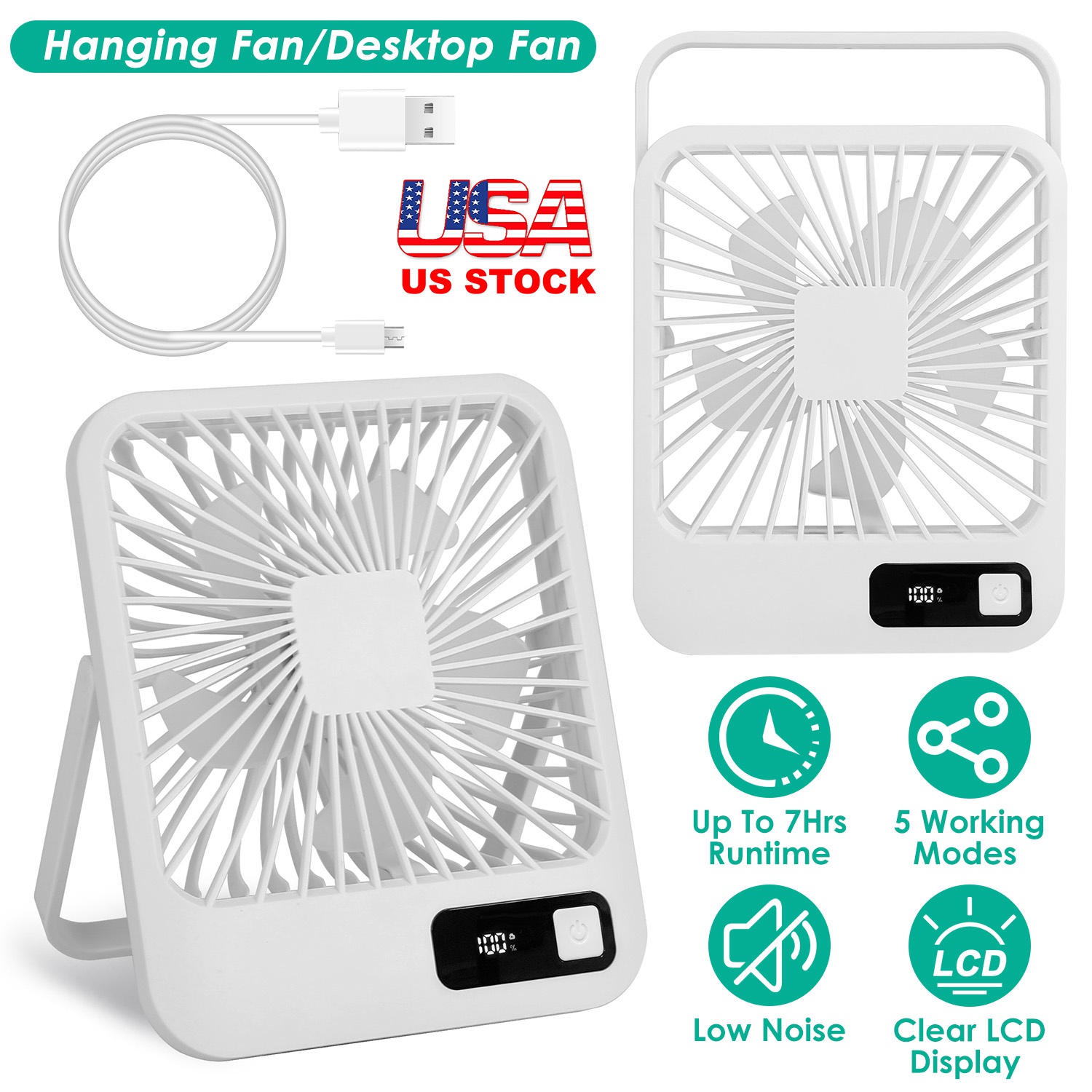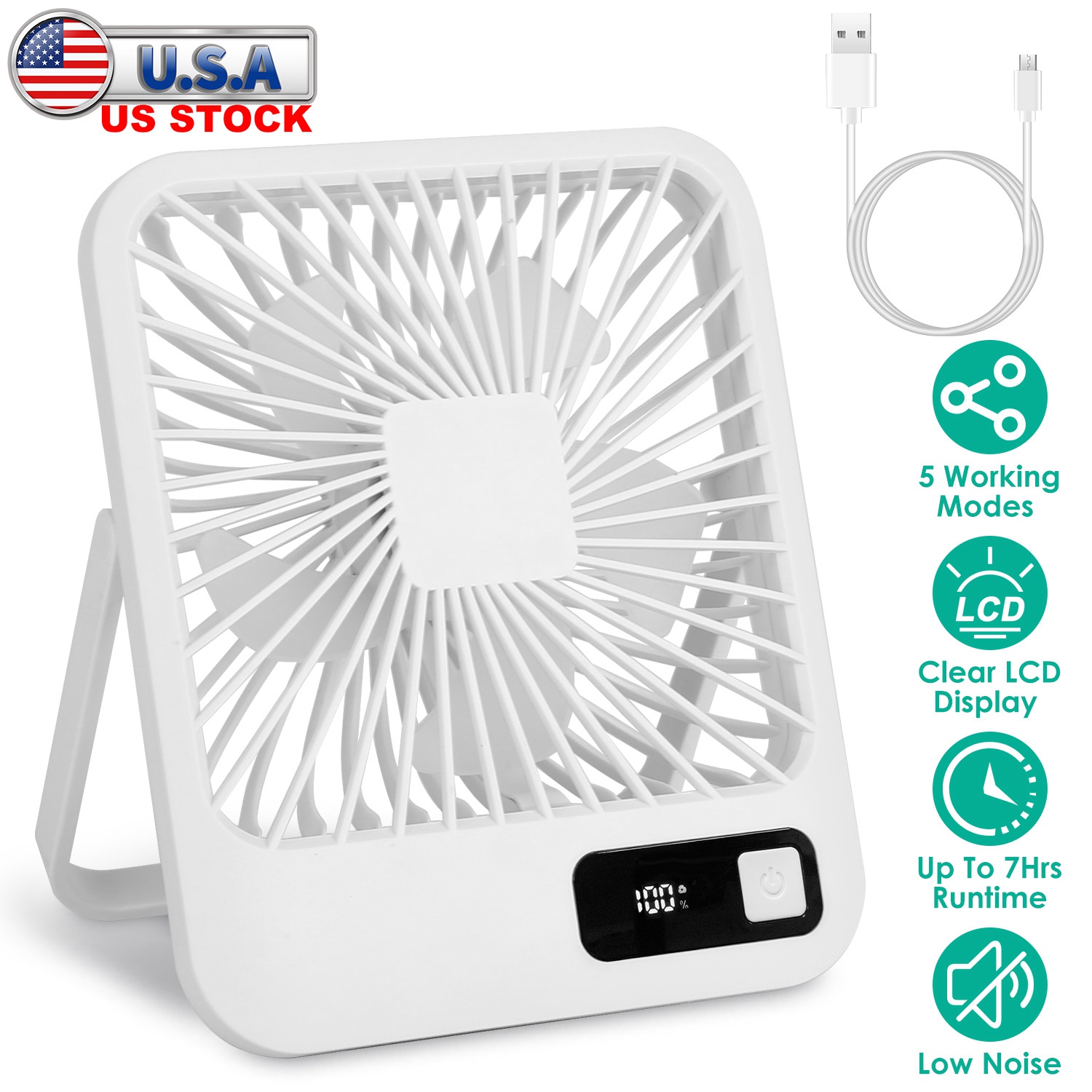 Getting too hot to sit at that desk of yours and wish you had some kind of breeze to help? Well now is your chance with this mini desktop fan. Just plug it into the USB port of your computer, laptop, or any other standard USB port from a hub or outlet and off you go! 5Pcs upgraded gull wing shaped fan blades create a cool breeze and balanced wind blowing to cool you off with 4 speed adjustment. The fifth considerate circulating modes bring you cool winds with variant speeds and no need to press the button frequently. 180 Degree rotatable bracket enable you to put you fan on the desk or hanging on the hook. LCD Display shows the remaining battery and let you charge the fan in time. Child safe use and quiet natural wind provides you endless cool wind in summer.