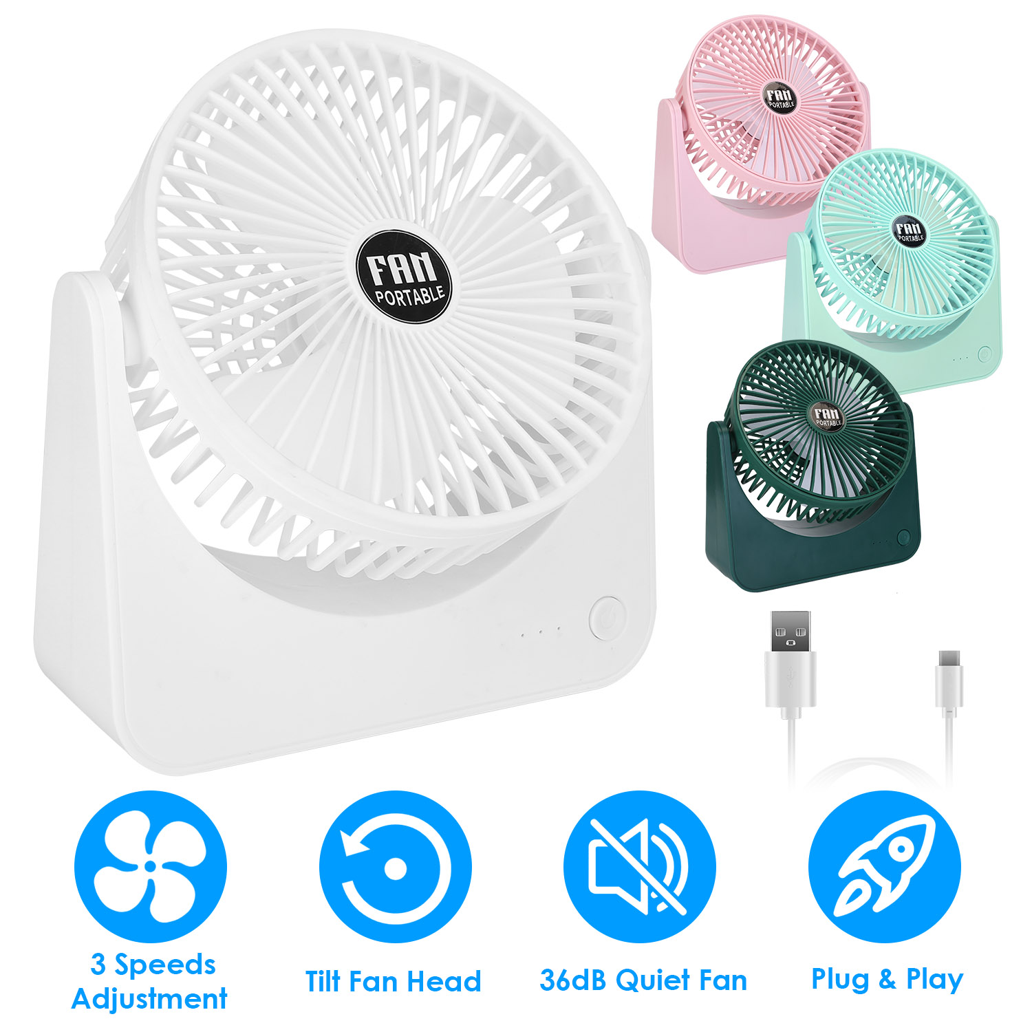 The hot summer is coming, our desk fan is the best cooling partner with you! Featured with 3 adjustable wind speeds,3 blades and tilt head, it can be adjusted to any angle and cool you down quickly. Lightweight and compact, you can carry it from one room to another room. Come with Type C cable, easy to supply power and no need to frequently change battery. Support multiple power supply, the USB fan is compatible with computers, laptops, car charger etc.. Stably rest on the table and low noise, our fan won’t disturb you. Perfect summer cooling gift for you, your friends or family!