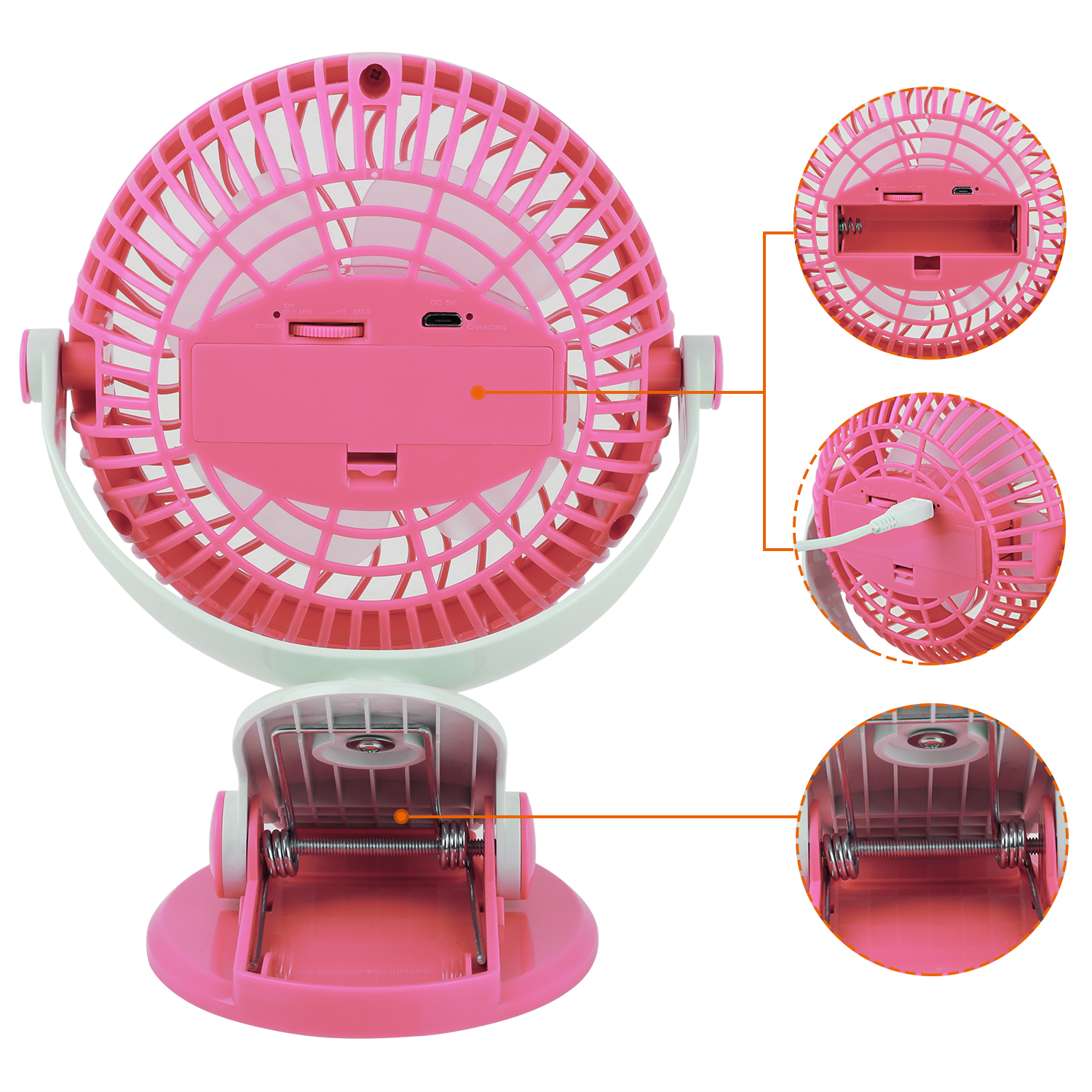This portable USB mini fan can be used as not only a desk fan, but also a clip fan. The wind speed and direction is allowed to adjust as desired and on high it can put out a good amount of air if regulate fan speed to be fast. It is perfect addition to a stroller wagon and easy to clip to the frame, parents’ supervision will be required when the fan is working because a baby is likely to get fingers inside the slots and get hurt. Besides, you can recharge it through a USB car charger, USB AC adapter, or laptop. Note: Check the battery is put correctly into the power compartment according to the positive pole and the negative pole when charging. Otherwise that may damage this fan.