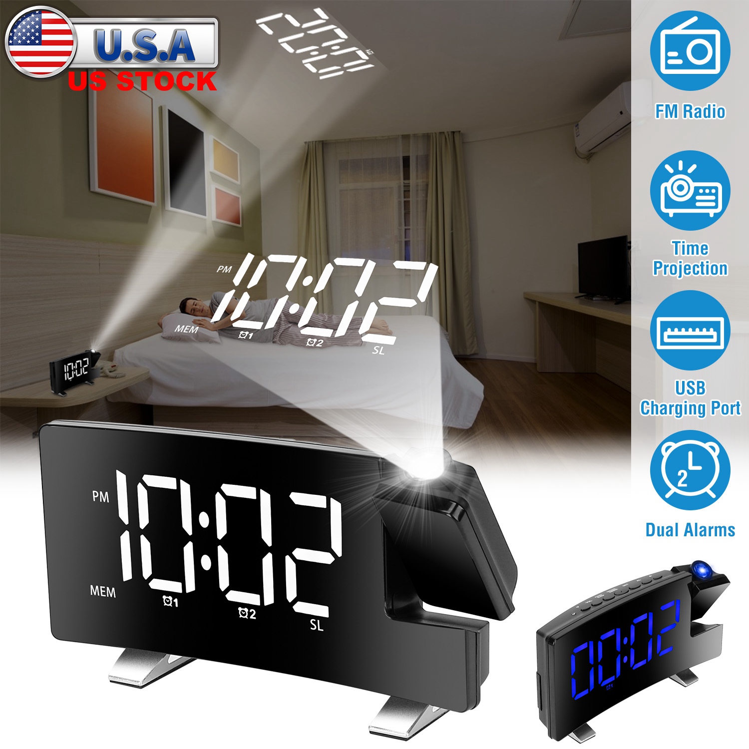 Home > Projection Alarm Clock with Radio Function 7.7In Curved-Screen LED Digital Alarm Clock w/ Dual Alarms 4 Dimmer 12/24 Hour USB Charging Port 180° Rotat