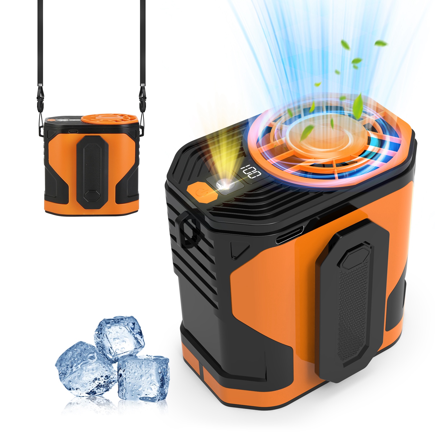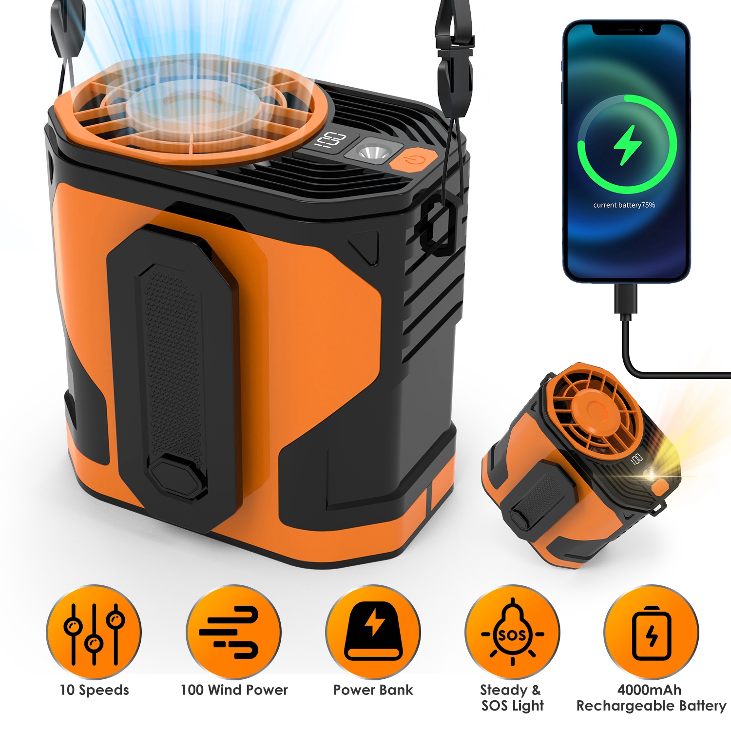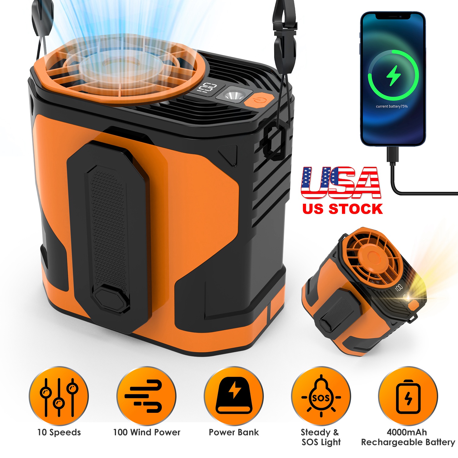 Tired of sticky summers and overheating at work or play? The wearable waist fan is your game-changer! Combines a waist clip fan, emergency flashlight and backup power bank. Features 10 wind speed levels, 100 wind power units, steady and SOS light. Built with 4000mAh rechargeable batteries, keep you cool for up to 6 hours. Doubles as a power bank for emergency charging of your phone or earbuds. Perfect for outdoor enthusiasts on the go or anyone seeking relief from summer's scorching heat, whether you're hiking, working on a jobsite, camping, or commuting… Clip it to your waist or strap it around your neck, beat the scorching heat and enjoy hands-free and powerful cooling!