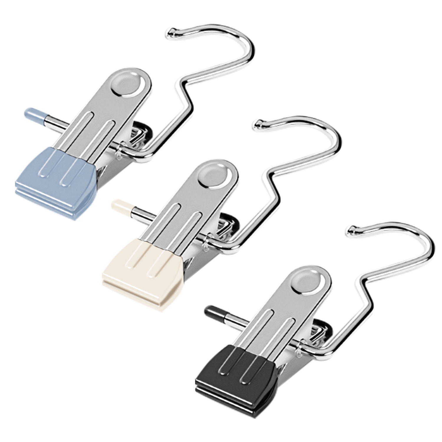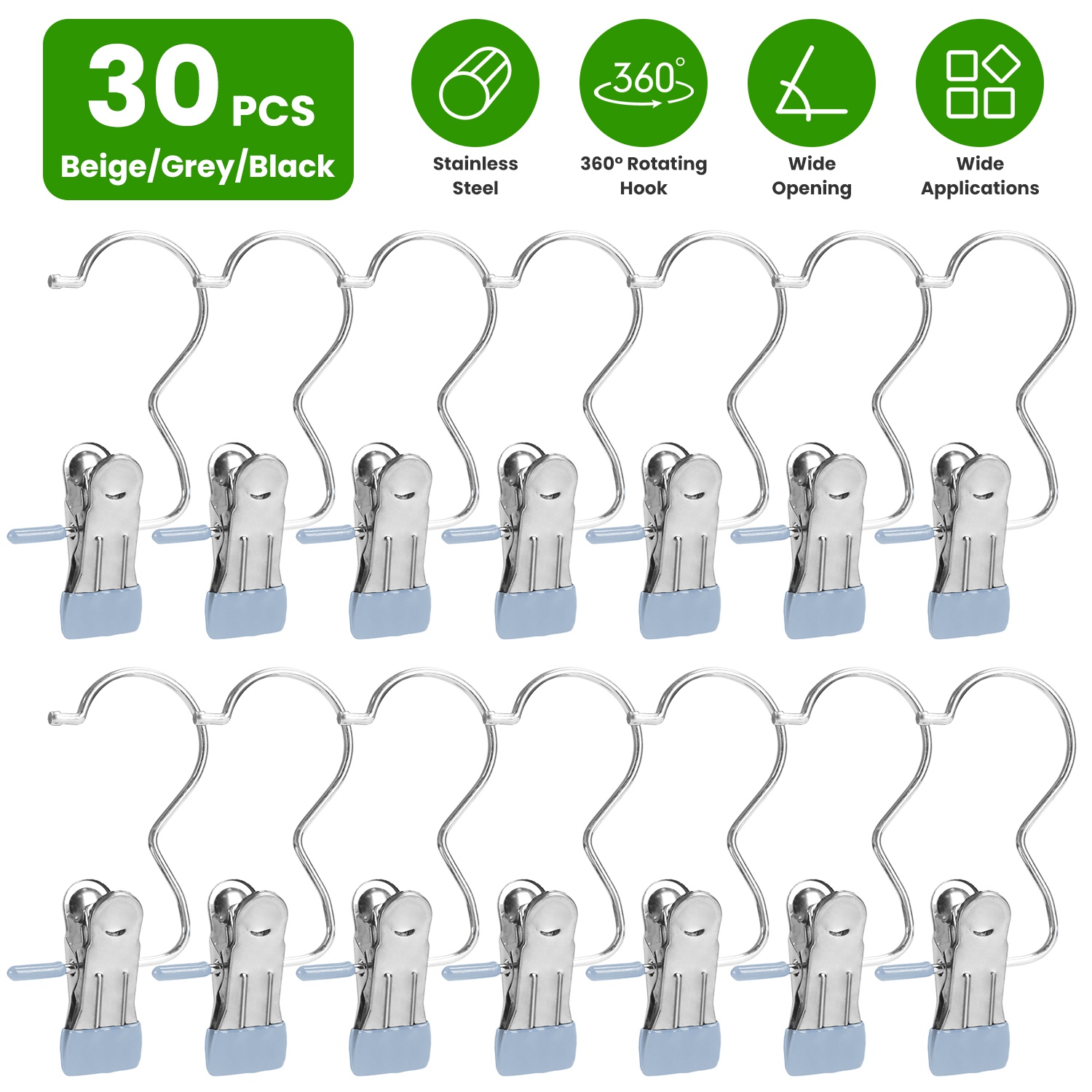 Your boots or clothes always leave a mark after longtime hanging? Try our 2 in 1 hanger clips! Constructed out of premium stainless steel and coated with rubber, our laundry hooks boast rust-resistant feature and are capable of hang your clothes securely without leaving marks. Sturdy enough to hold various clothes, pants, boots, hats, towels, socks, handbags, pillows, belts, snack bags etc., not easy to bend, deform or break, suitable for both dry and wet environments like closet and bathroom. In addition, you can have 360° rotating hooks and 2.5cm/0.98in wide opening clips at the same time, which can greatly help you organize your room and streamline your life with 30 handy packs. Must-have home essentials for clothes organization!