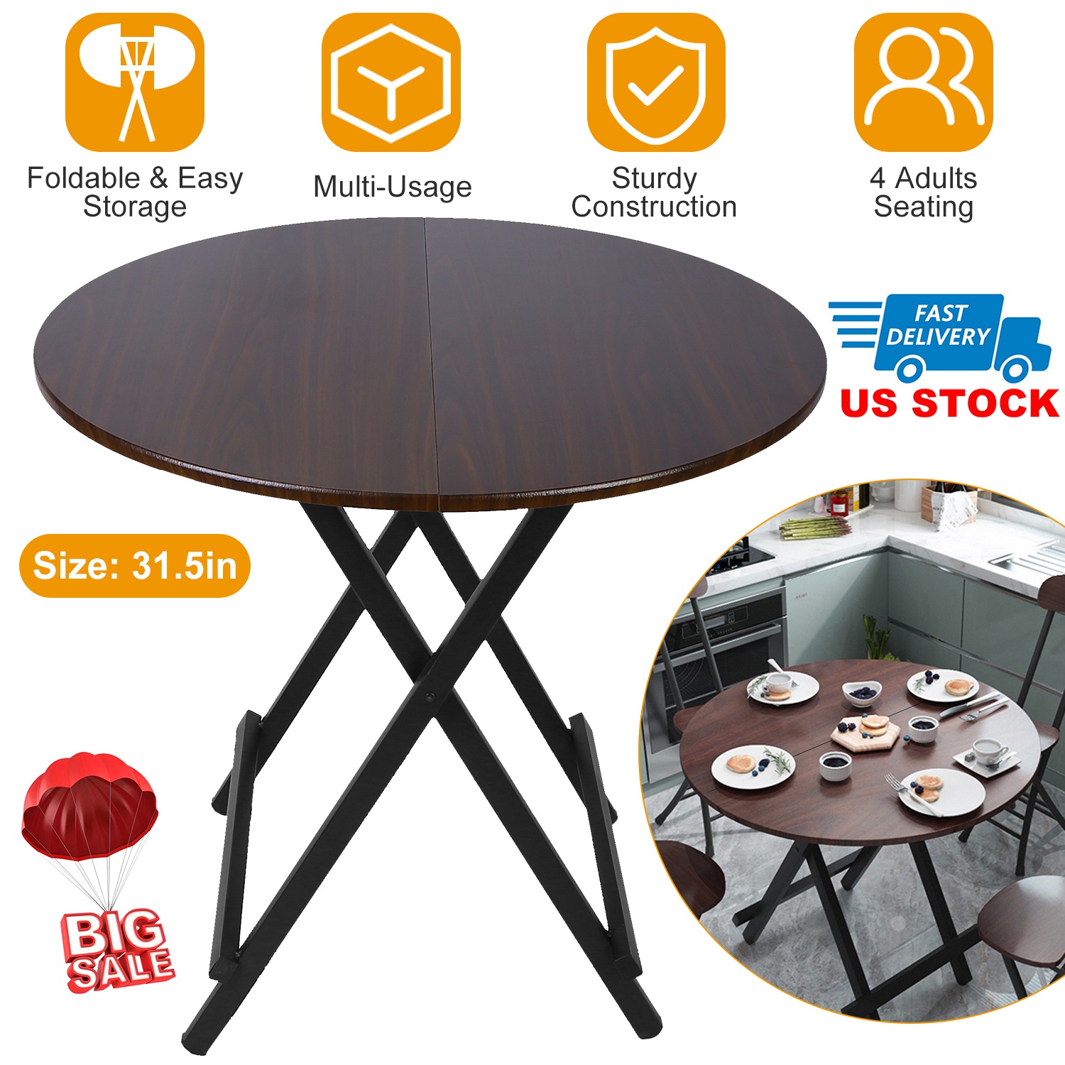 Our 31.5in round folding table allows about 3-4 adults to sit by it, ideal for outdoor use, such as picnics, camping trips, etc.. Foldable top and legs design make it easy to store when not in use. Made of premium MDF and iron, and come with 4 anti-slip stoppers, with smooth corner design, it provides security and stability.
