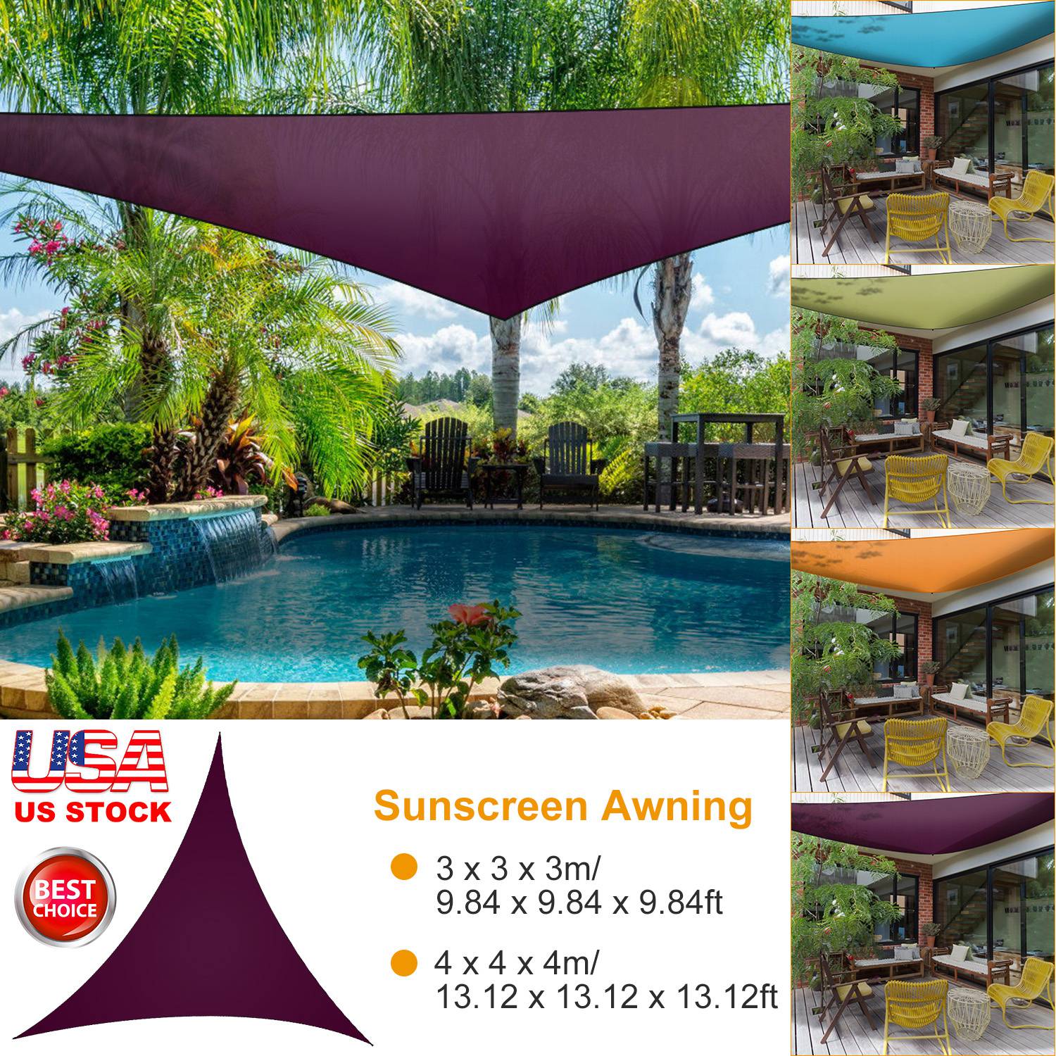 Our Shade Sail Top Canopy, made of polyester taffeta material, is waterproof and can block the sun for you, which is durable enough to last a long time. All durable edges, which are reinforced, can properly tension. Pull the rope tighter, keep knots stay tight without any slipping. You can use it in the patio, lawn, garden and so on in the sun or in light rain. But do not use it in heavy rain.