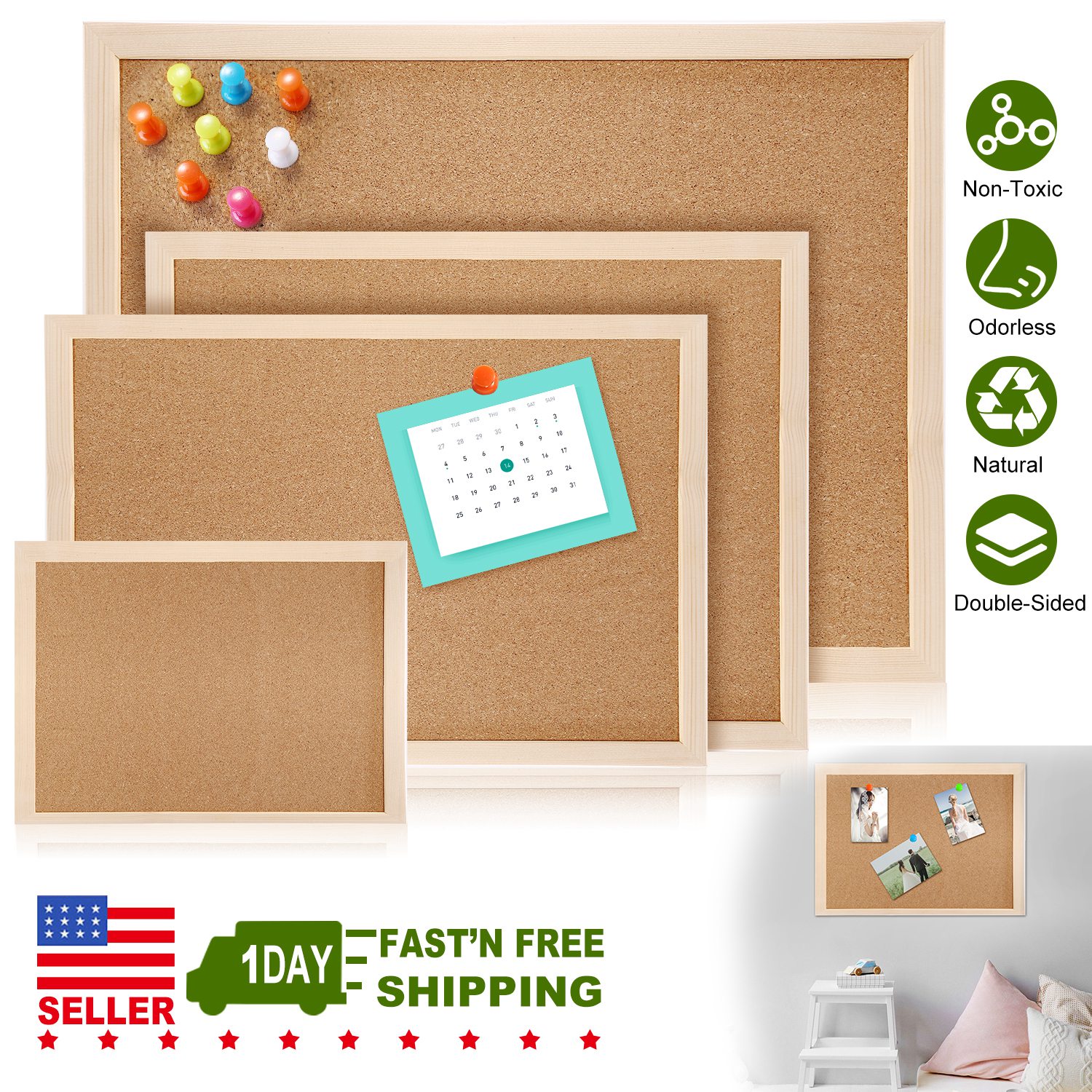 Our cork board is made of premium natural cork and solid wood frame, 100% safe, non-toxic and odorless. The well-polished frame is smooth and comfortable to hold without hurting your hand. The reusable cork board is very easy to use, you can pin your notes, messages, photos and any other papers to the board by using the included colorful pushpins. There also is a hemp rope and 2 steel hangers for you to hang the board on the wall horizontally or vertically, which can be finished in short time. The light-weight ensures the board won’t fall easily. We offer you 4 optional size (S, M, L and XL),you can choose your size according to the space and your needs. The cork board is suitable for multiple occasions: you can use it in living room for photos, study room for notes, office for working memo, and in school and shops for posters and advertisements.