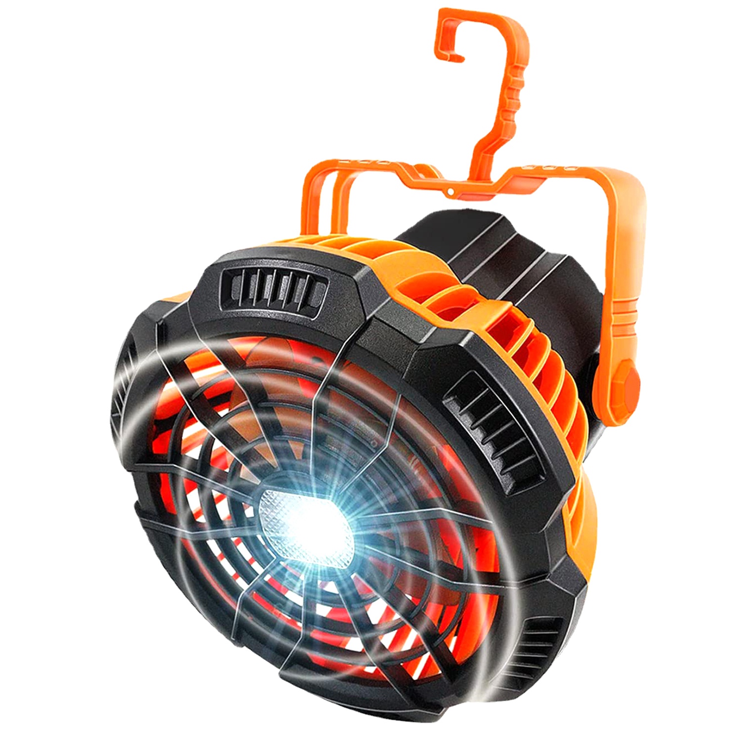 This is a versatile tent fan that can satisfy more than one need. For one thing, the fan has three light modes and wind modes to choose from separately: low, medium, and high. In addition to that, the fan features a hook on the top. The hanging style-tent can push a decent amount of air around. It also serves as an emergency power supply for phone charging. A perfect companion for outdoor activities like camping and fishing.