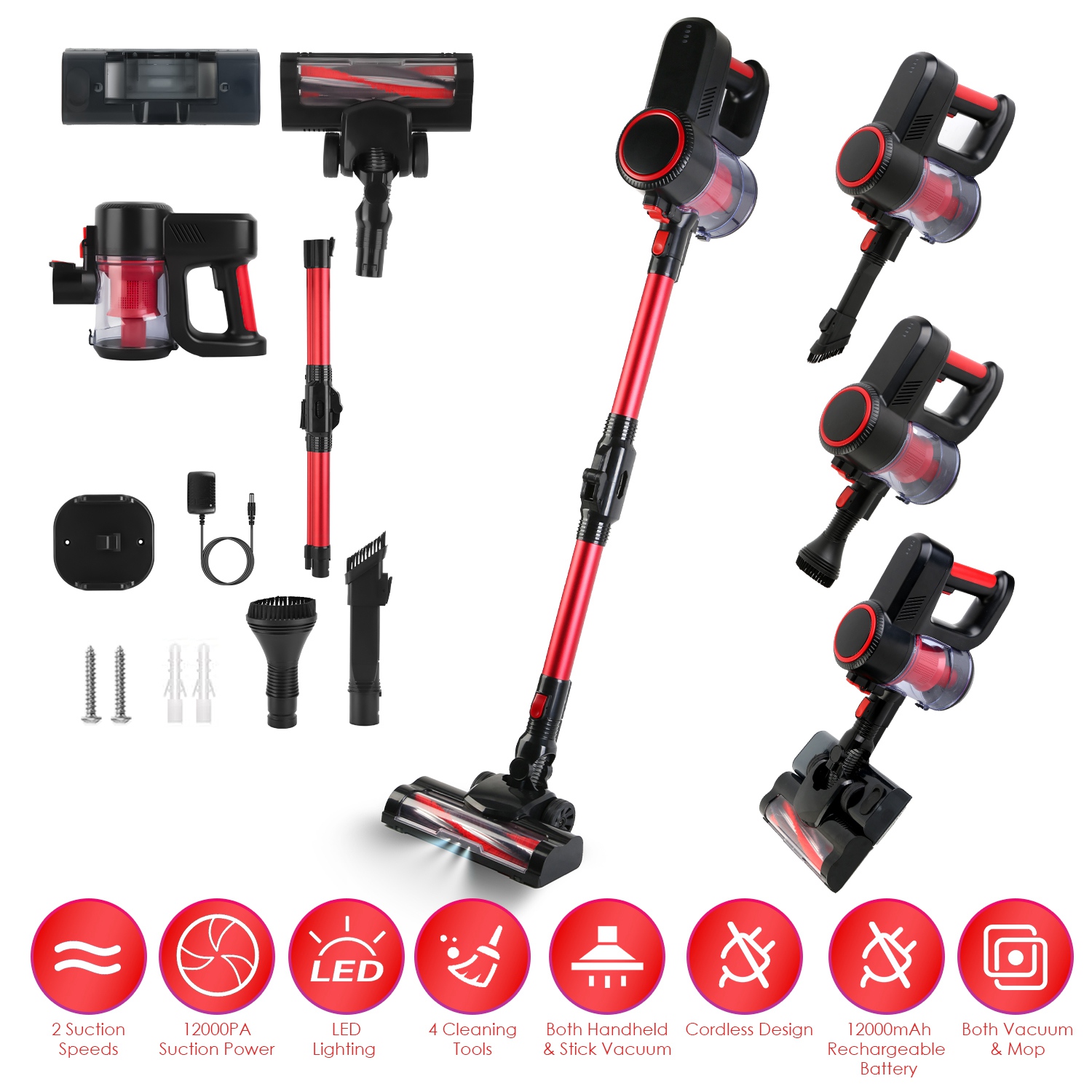 Home > Cordless Vacuum Cleaner Lightweight Handheld Vacuum Upright Stick Floor Vacuum Battery Powered Mop with Lighting 2 Speeds 12000PA Suction 4 Tools Moun