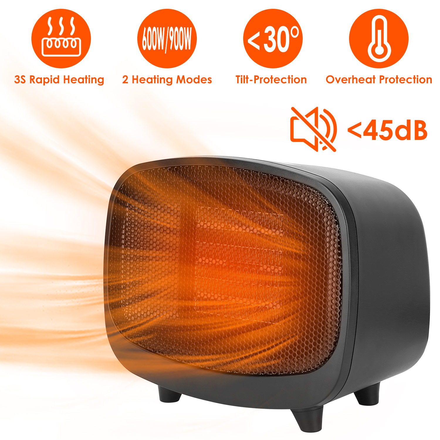 With the winter coming, our space heater can quickly create hot air in 3 seconds, making you feel warm and cozy while you are in office or room. Simply press the button to adjust 900W high or 600W low heating mode. Overheat and tip-over protection makes the space heater shut off automatically when heating parts over 248℉or knocked over 30° tilting angle. Mini and fashion retro design makes it an ideal Christmas gift for family and friends!