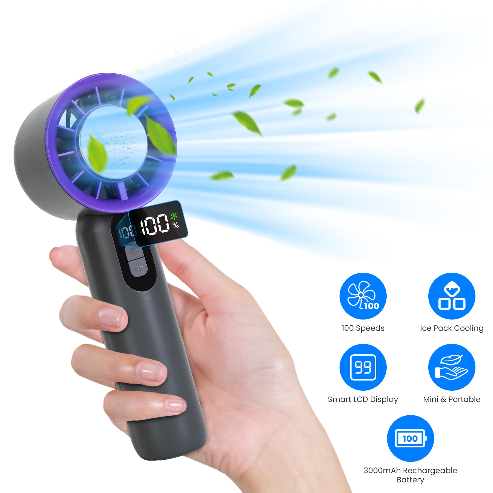 100 Speed Handheld Fan With Ice Cooler High Speed Turbo Fan 3000mAh Rechargeable Hand Fan with LCD Display for Travel Camping Beach Outdoor