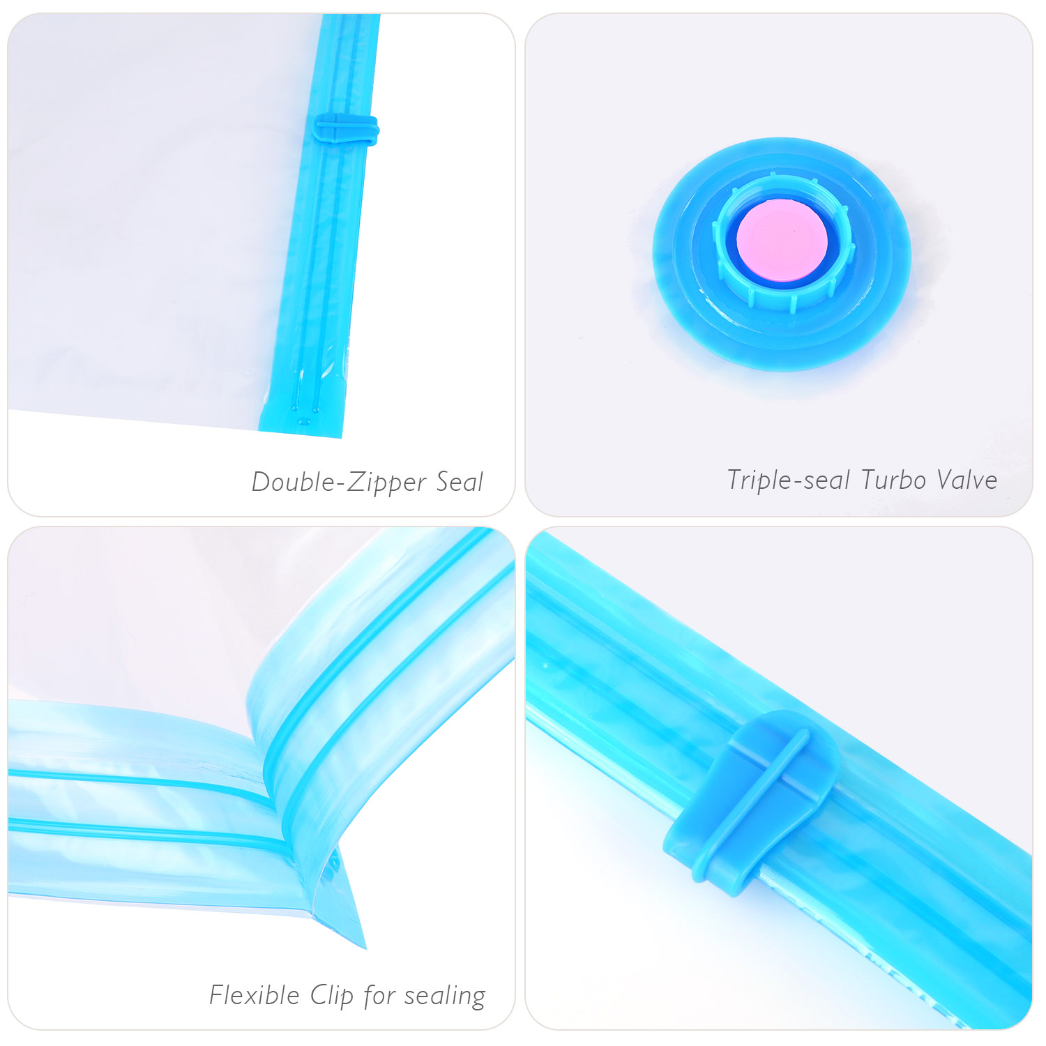 These bags of limitless storage can hold just about anything fabric that you need squishing down into a manageable block. Reduce the original volume by almost 80%. You can use these for blankets, comforters, mattress pads, large pillows, winter clothes, and dryer sheet to save closets space around your house. It also works awesome while you are moving.