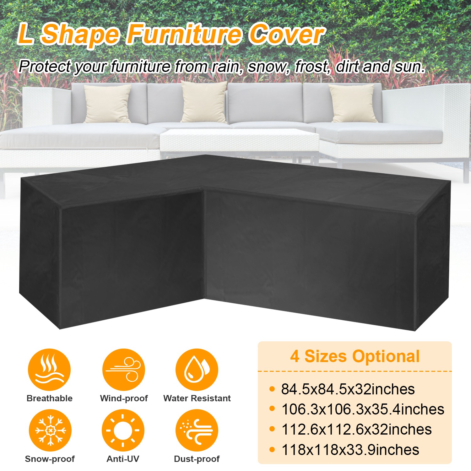 Our furniture cover featured with L shapes, adopt premium polyester materials with PVC coating, water resistant and anti-UV, protect our outdoor furniture from dust, rain or other bad weather condition, a way to save money for keeping furniture in good shape and color. Fine stitching workmanship and adjustable hem cord is easily and tightly to cover your furniture. Easy to fold and store in our included bag. Fits for L-shaped furniture or sofa set.