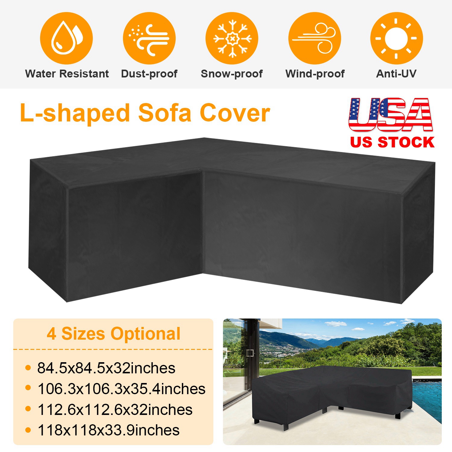 Our furniture cover featured with L shapes, adopt premium polyester materials with PVC coating, water resistant and anti-UV, protect our outdoor furniture from dust, rain or other bad weather condition, a way to save money for keeping furniture in good shape and color. Fine stitching workmanship and adjustable hem cord is easily and tightly to cover your furniture. Easy to fold and store in our included bag. Fits for L-shaped furniture or sofa set.