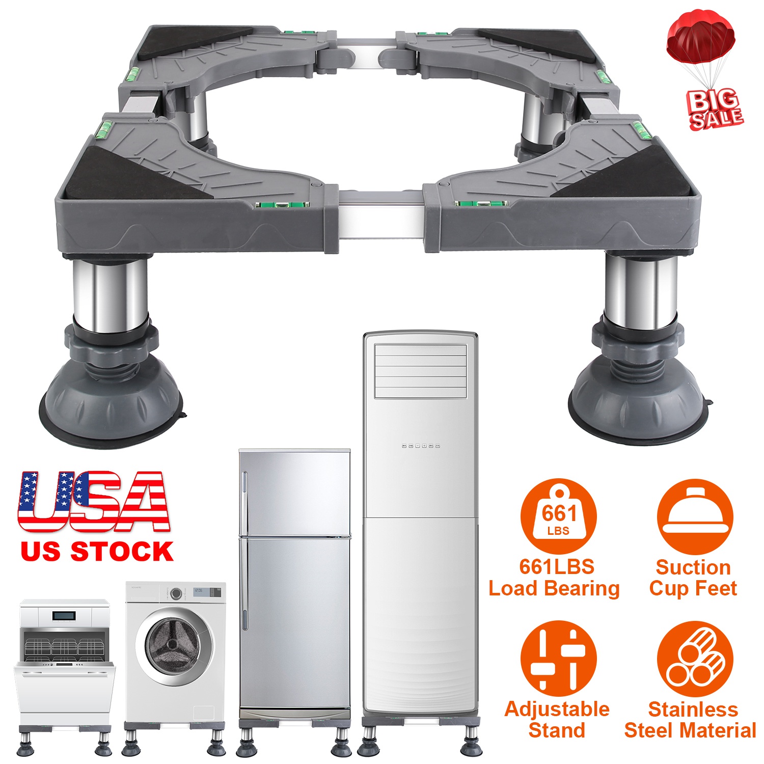 Hard to clean the floor covered by the washing machine? Annoyed by the rust and corrosion on the bottom of appliances? Come with adjustable sizes, 16.14-27.16in in length and width, 6.29-7.48in in height(Included the base), our heavy duty mini fridge stand can be widely used for electric household appliances, like refrigerator, washing machine, air conditioner, humidifier, dishwasher, cabinet and etc.. Anti-slip suction feet can be firmly attached to the smooth floor, increase the stability and reduce the loud noise during running. Built-in gradienter and scale effectively help you know if the level and size are correct. Made of durable stainless steel, sturdy construction ensures up to 660lbs load bearing capacity.