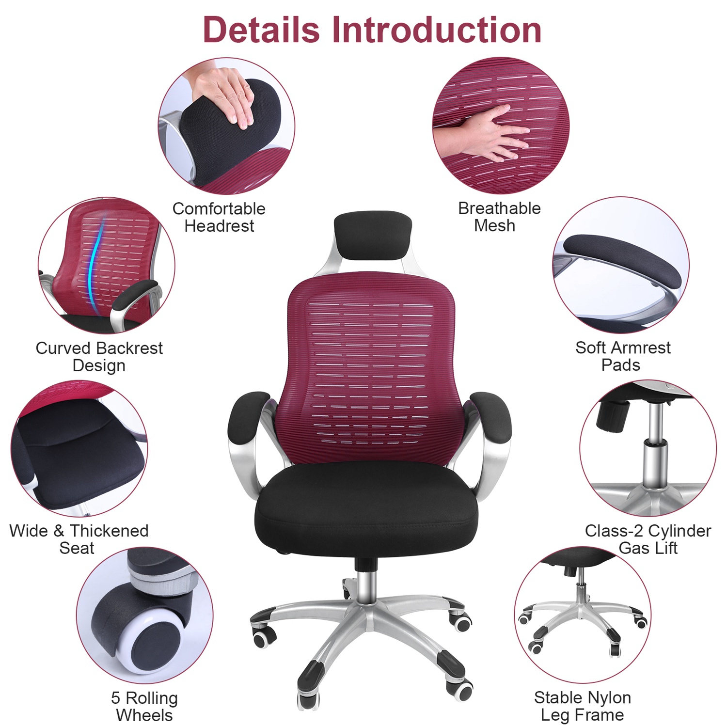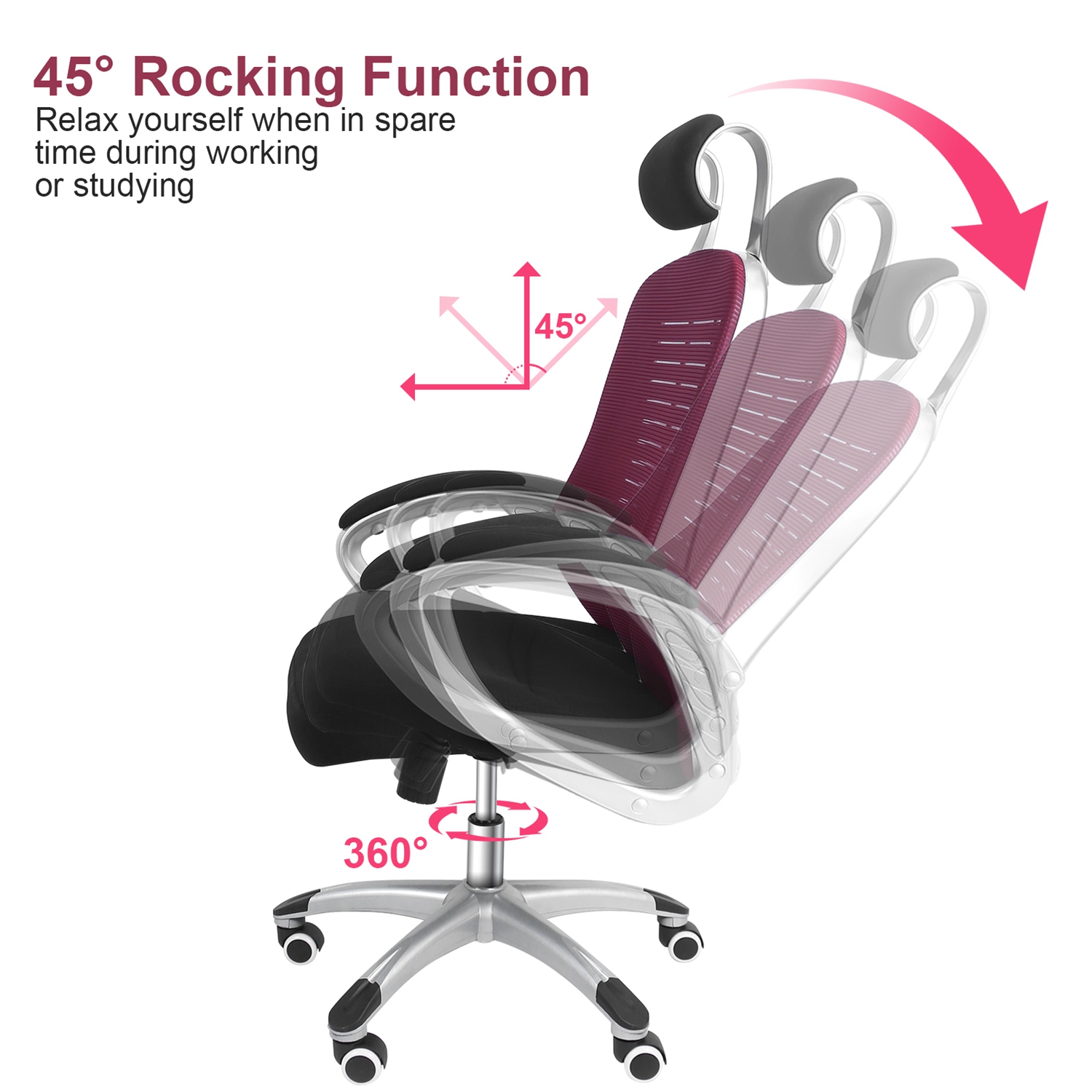 Come with high-elastic sponge cushion seat and ergonomic mesh backrest and headrest, our office chair is super soft and breathable for maximum comfort. 16.93-20.87in Adjustable seat height, 360° swivel design and 45° rocking angle allow you to adjust to the most comfortable height to sit or rest on it. You can also move it to anywhere easily with 5 smooth rolling casters. Great to use it as an ergonomic office chair, gaming chair, home desk chair, etc..
