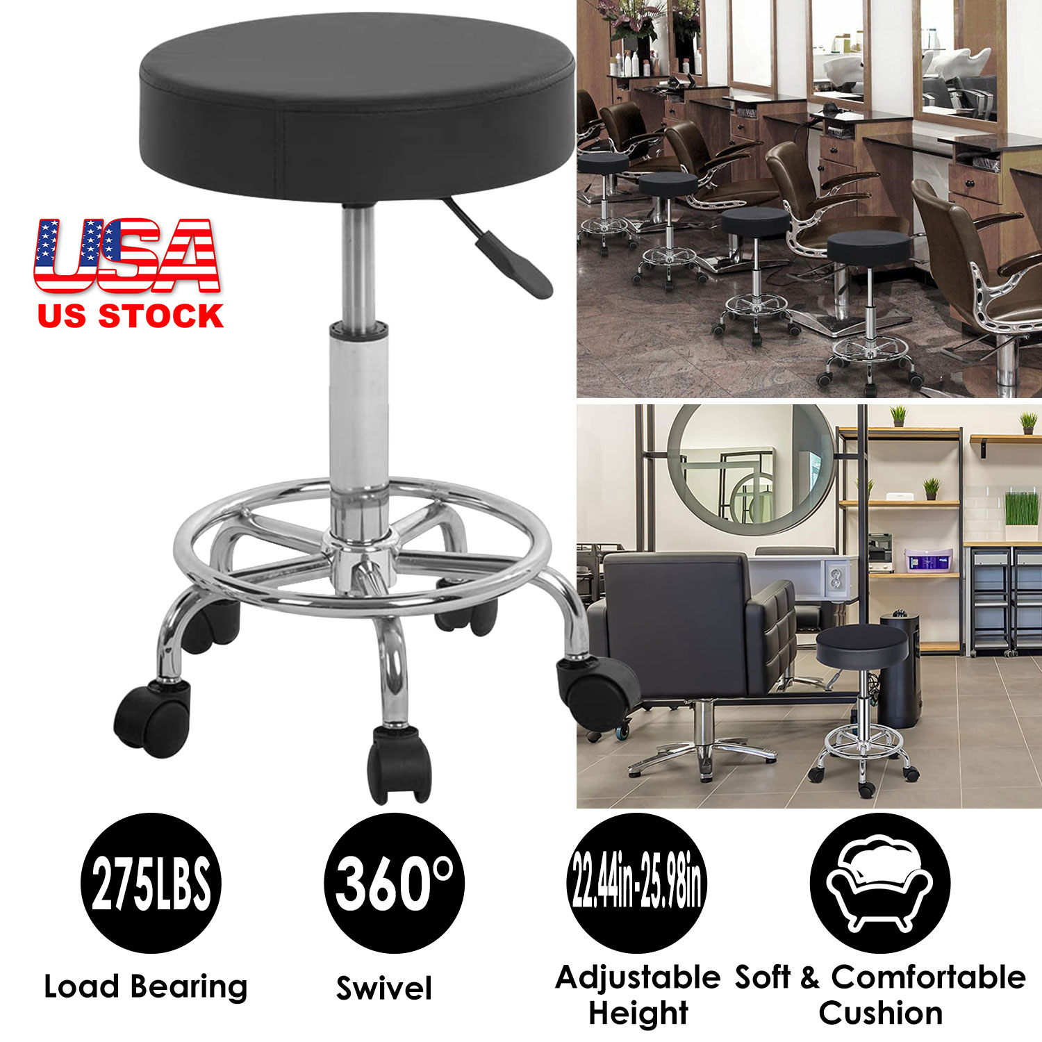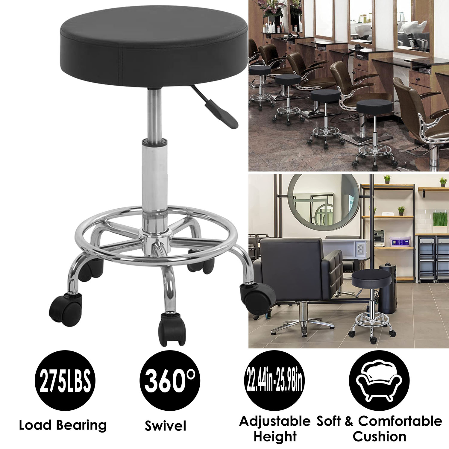 Home > Round Bar Stool Height Adjustable Salon Stools Leather Swivel Rolling Chair with Casters 275LBS Load Bearing for Kitchen Bar Dining Office