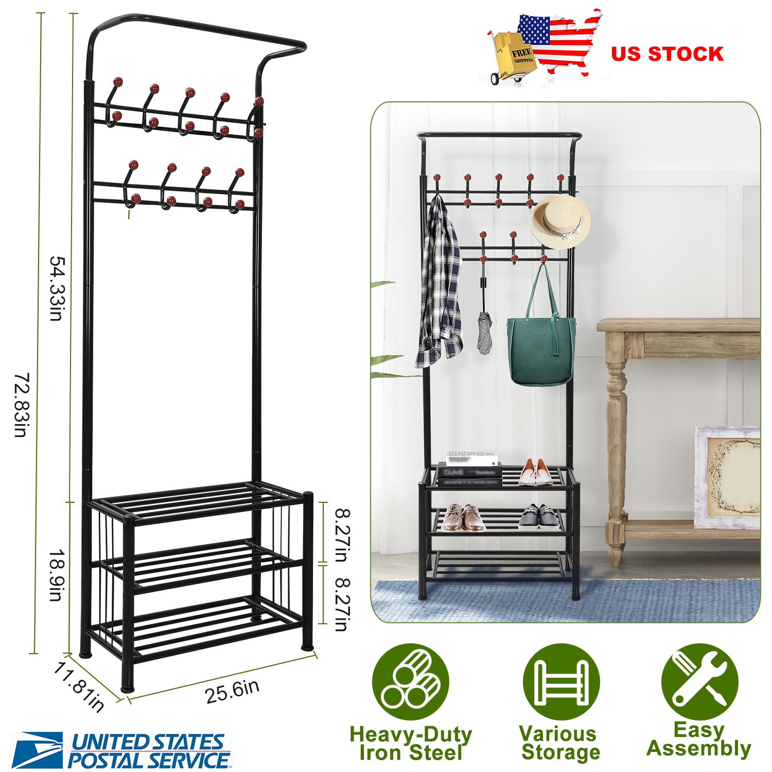 Our rack especially adopts a multi-purpose combination of coat rack, shoe rack and hanging rod to save space and keep neat and tidy of your living room, bedroom and office. It owns 18pcs metal hooks (can load up to 4.4lbs objects per hook) to hang various clothes, hats, scarves, bags, umbrellas, etc. and 3-tier metal shoe rack (25.6-inches-long and 11.8inches-wide and can bear up to 6.6lbs objects per tier) to organize shoes, boxes, potted plant, books, magazines, etc.