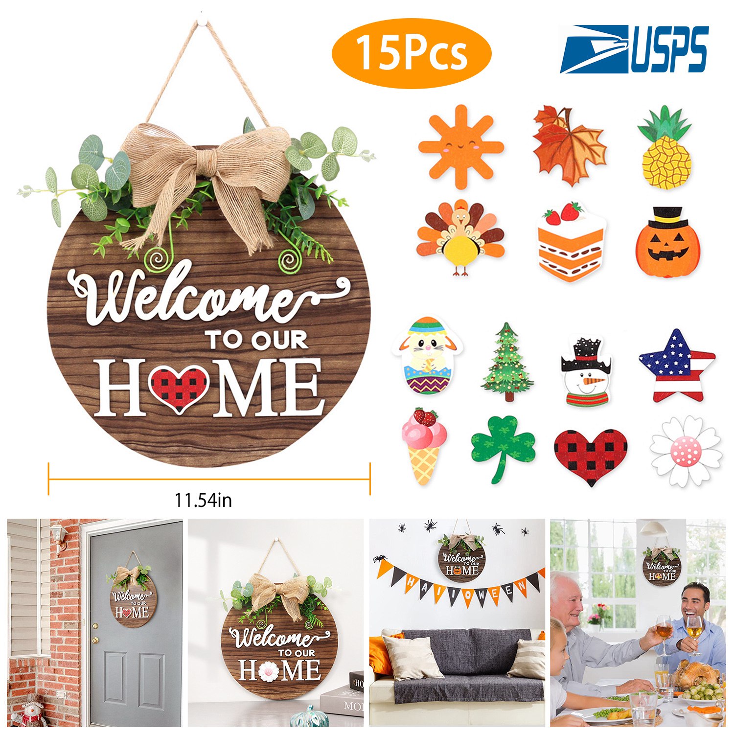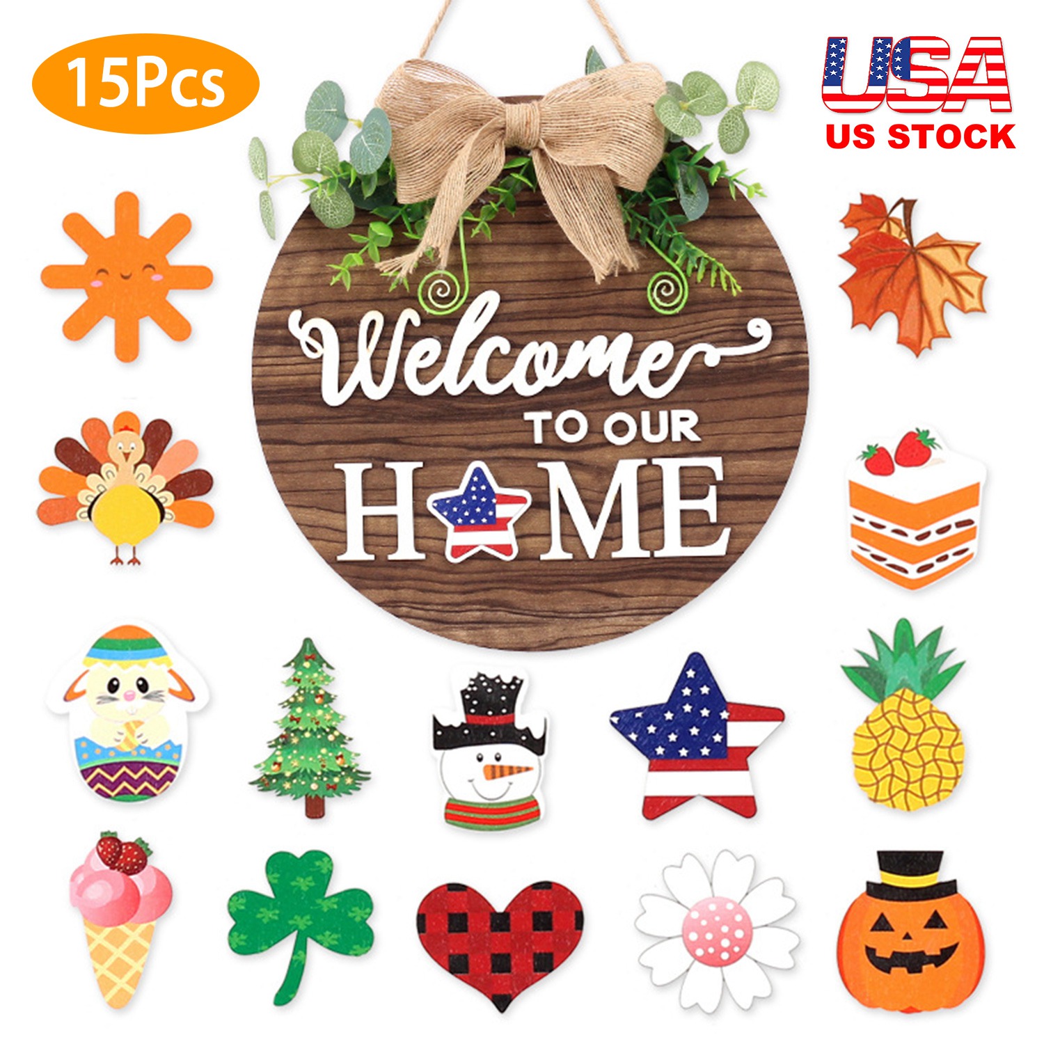 Interchangeable Welcome Sign Seasonal Wood Wall Hanging Front Door Decor with 14 Interchangeable Seasonal Icons for Halloween Christmas Thanksgiving D